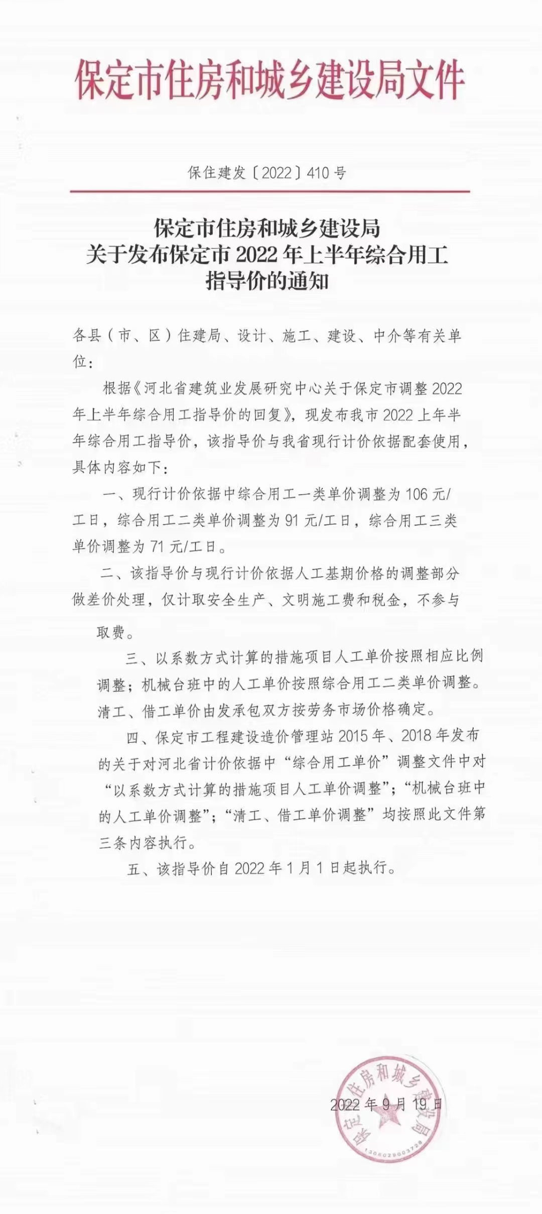 保定市住房和城乡建设局关于发布保定市2022年上半年综合用工指导价的通知